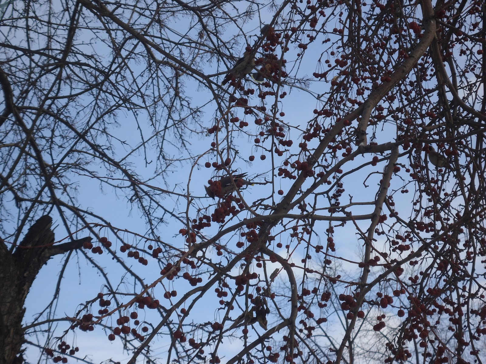 Началась весна. В город, как всегда, прилетели свиристели, и гроздьями висят на яблонях, склевывая оставшиеся яблочки.